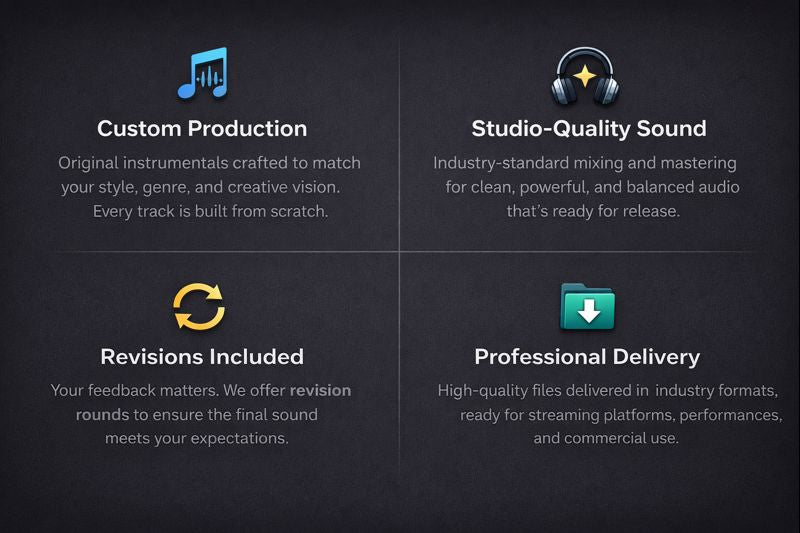 We provide custom music production, instrumentals, mixing, and mastering services tailored to artists, creators, and brands.